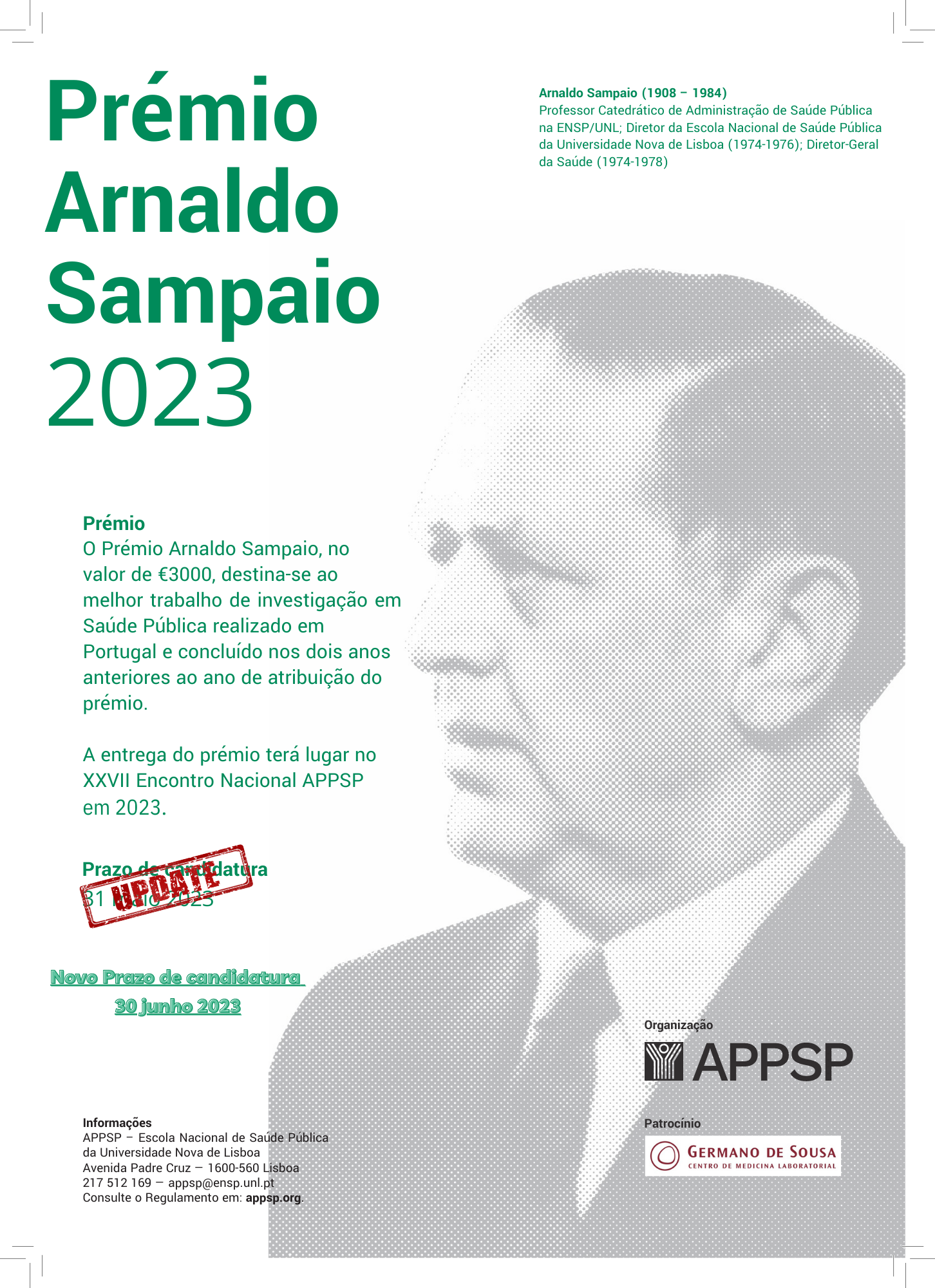 O Prémio Arnaldo Sampaio, no valor de €3000, destina-se ao melhor trabalho de investigação em Saúde Pública realizado em Portugal e concluído nos dois anos anteriores ao ano de atribuição do prémio.